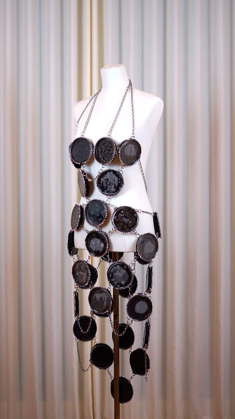 Angel Lartigue, Culture-Plated Dress (detail), 2025, Constructed by thirty-three sealed Petri dishes affixed to a silver chain and adorned with metallic rhinestones. Each dish is cultivated with charcoal agar to stimulate microbial growth at various stages, 58 x 39 in (147.3 x 99.1 cm)