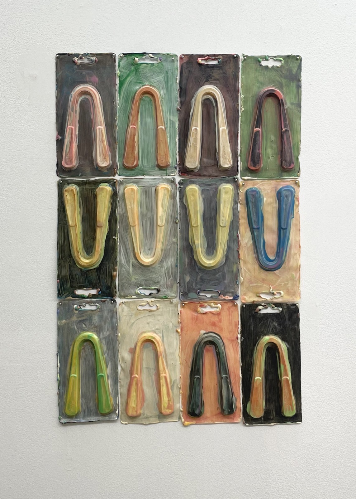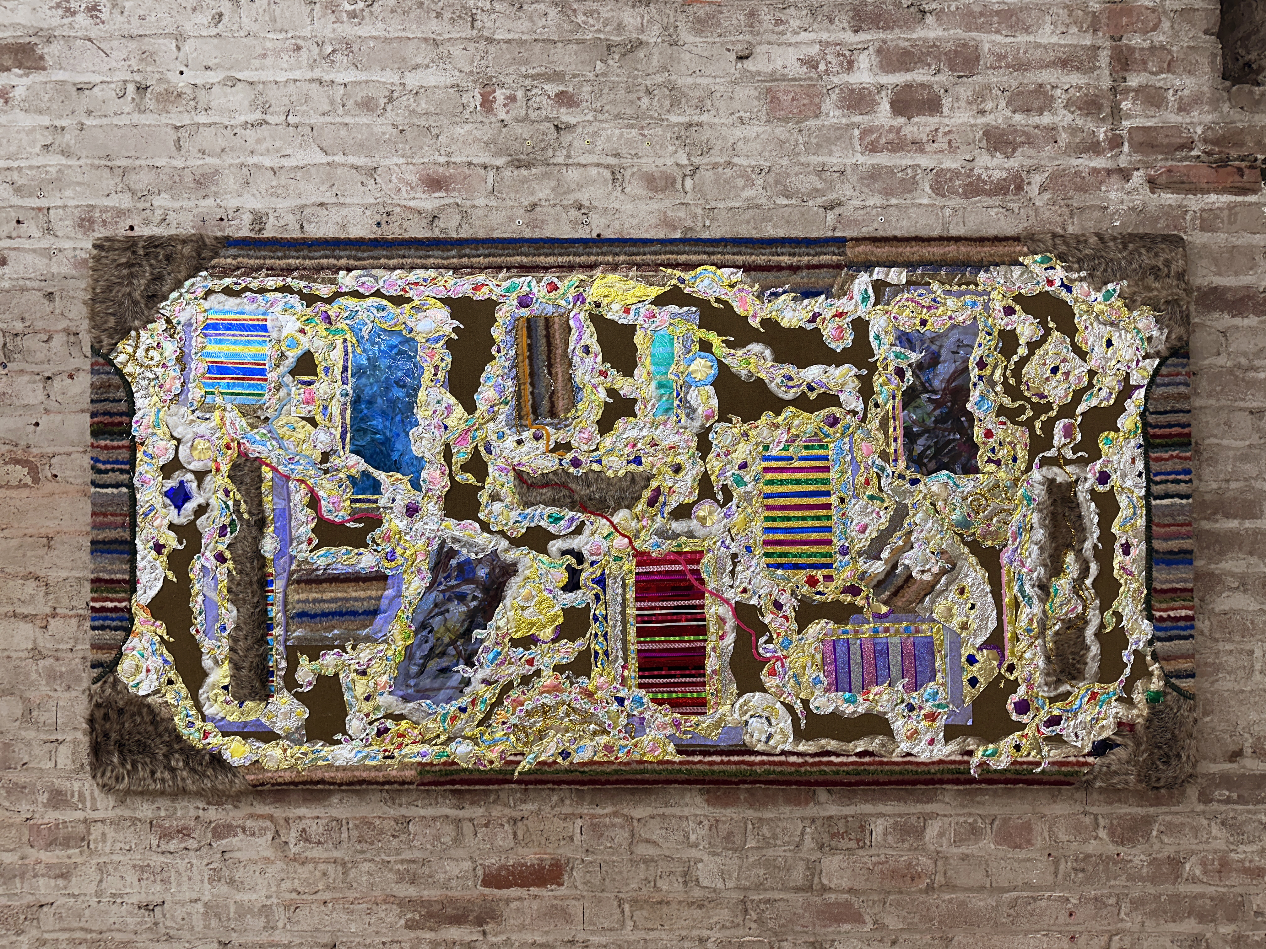 Foil, clear contact paper, theatrical gels, plastic wrap, pipe cleaners,tinsel, glitter, fabric, staples, and other media on panel