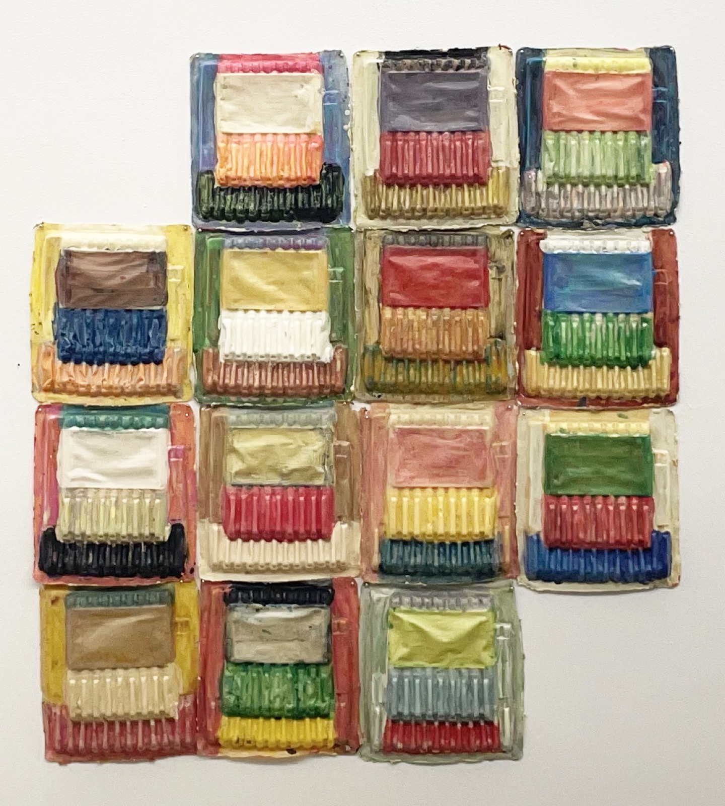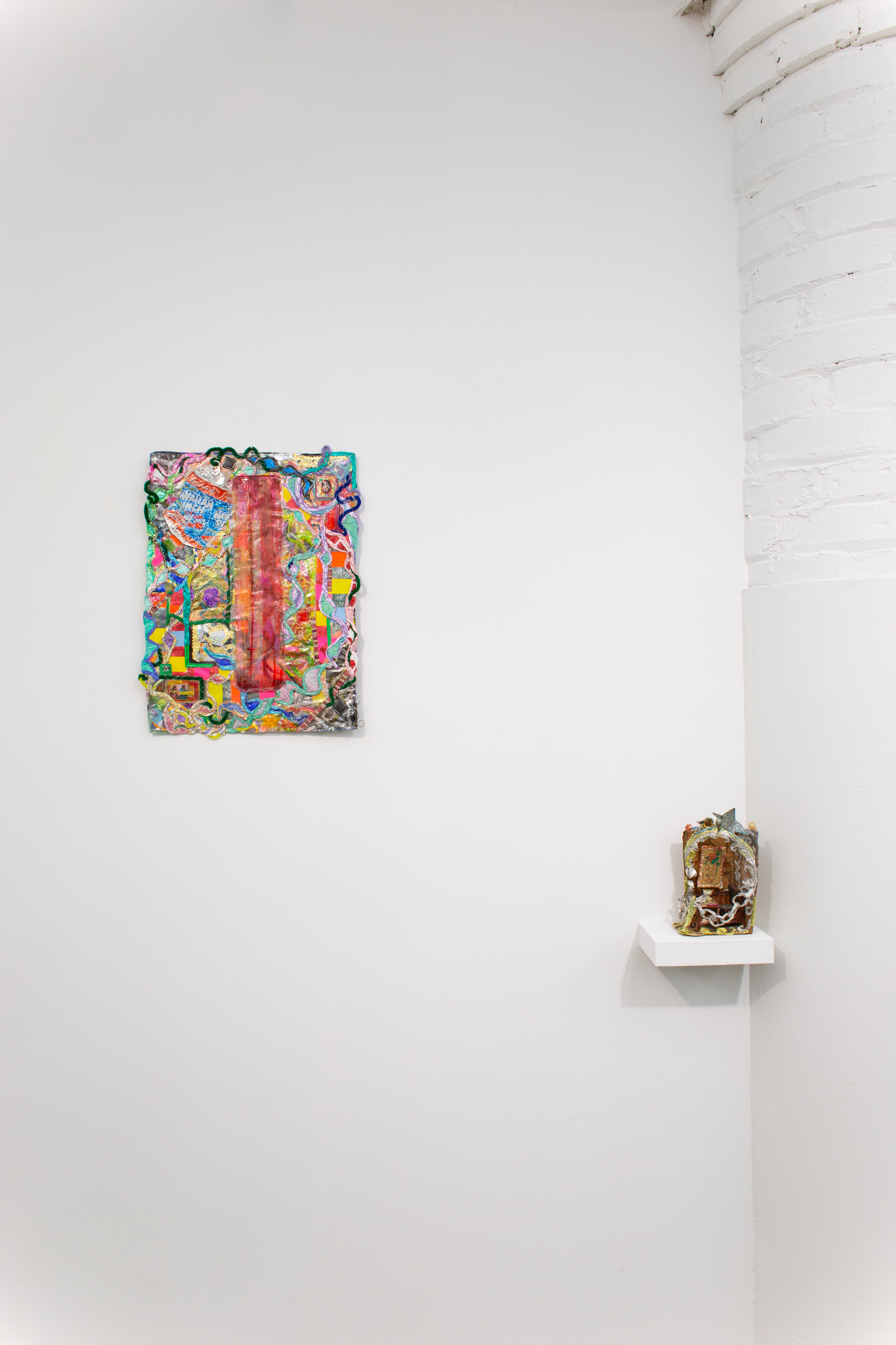 Foil, clear contact paper, theatrical gels, plastic wrap, pipe cleaners, tinsel, glitter, aluminum can, prayer card, staples, and other media on panel