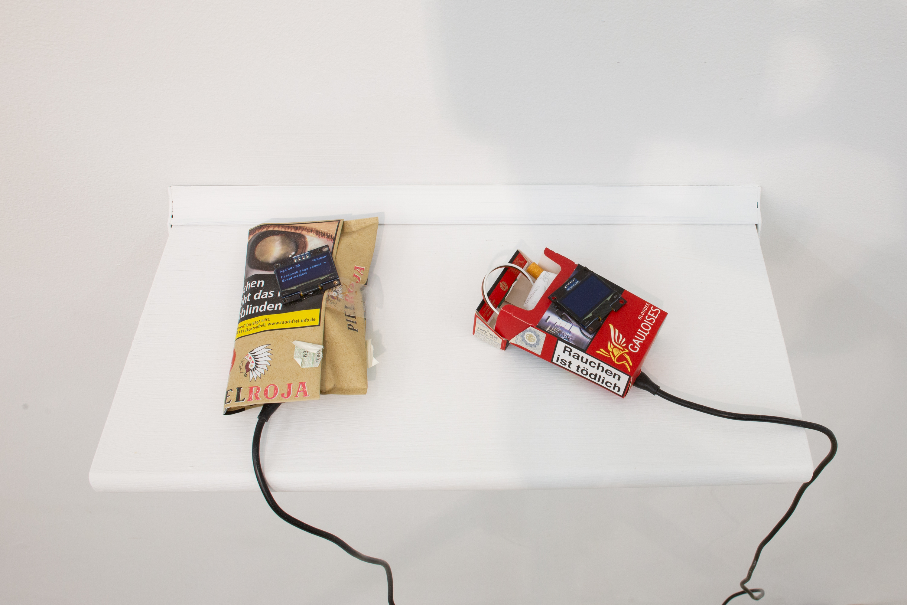 Cigarette box, microcomputers, live data (random miner), wires