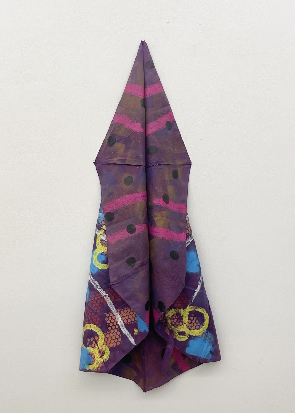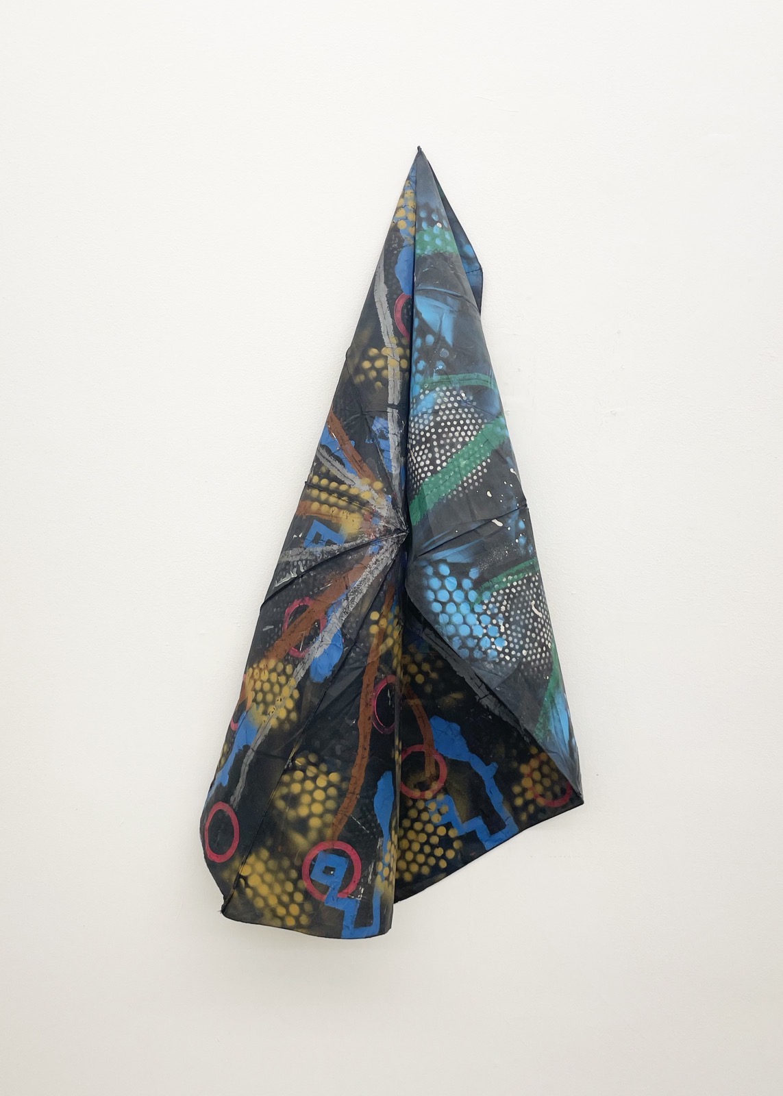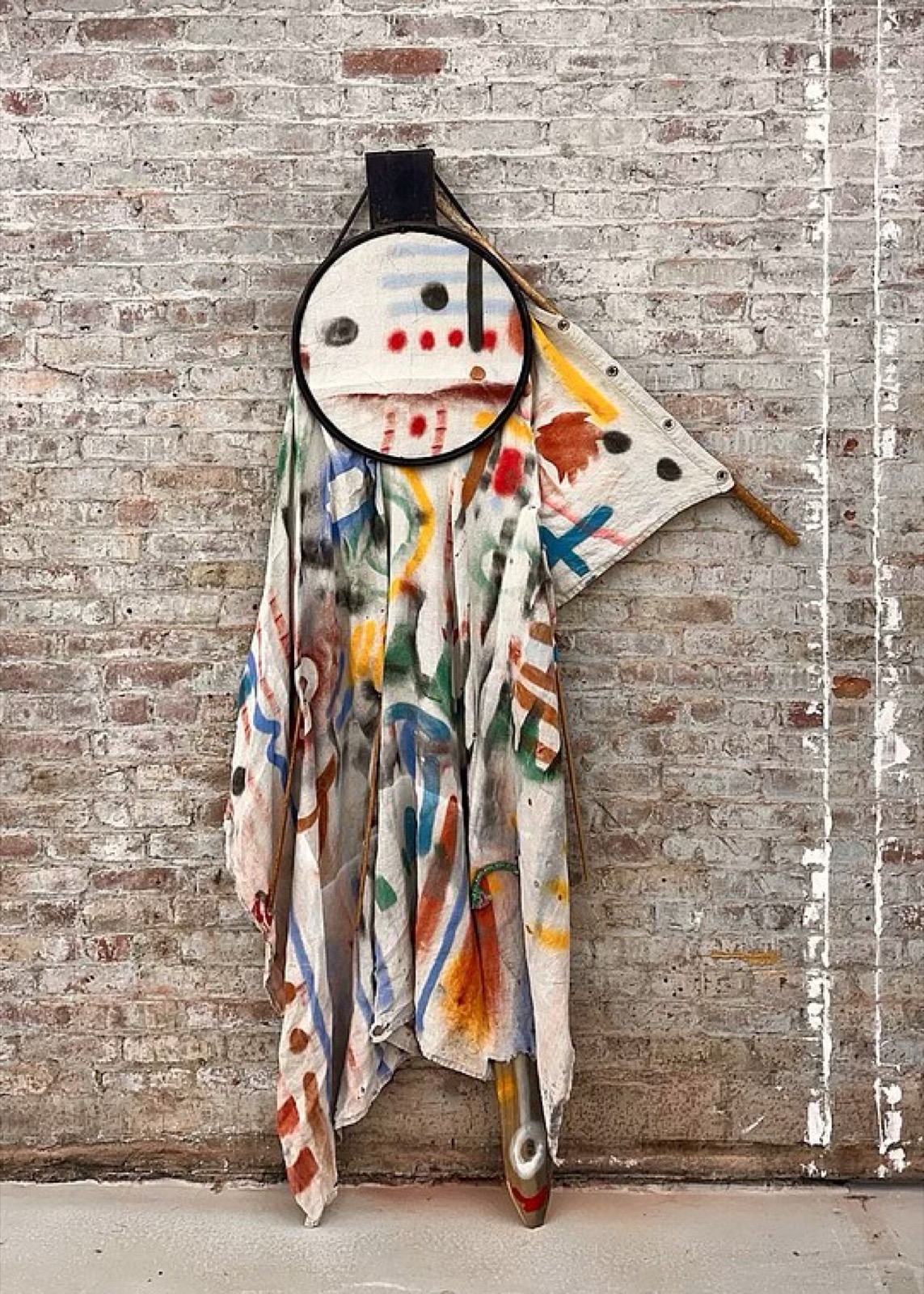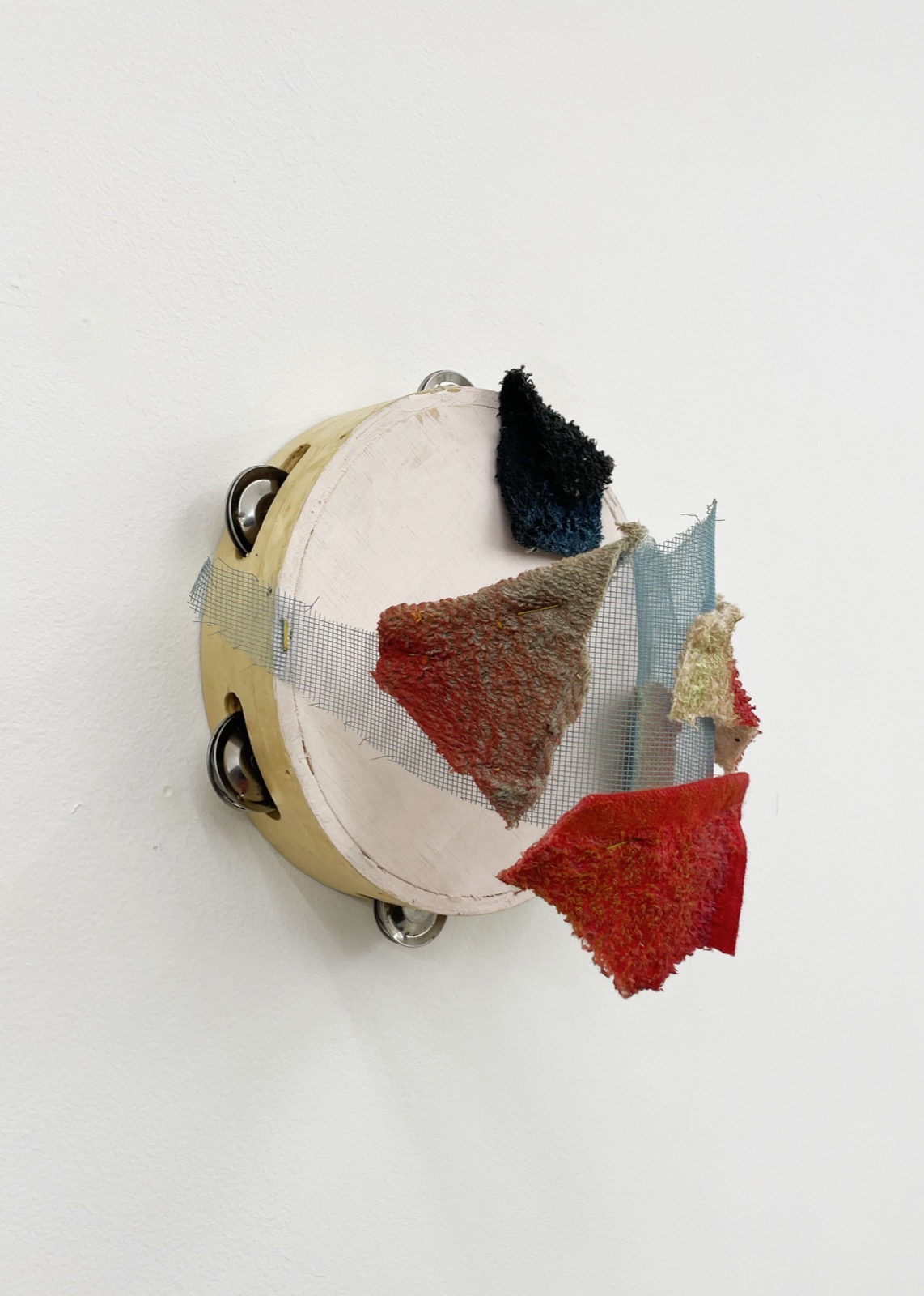 Wood, tambourine, ink, towel, stainless steel wire mesh, spraypaint, acrylic paint, staples, glue