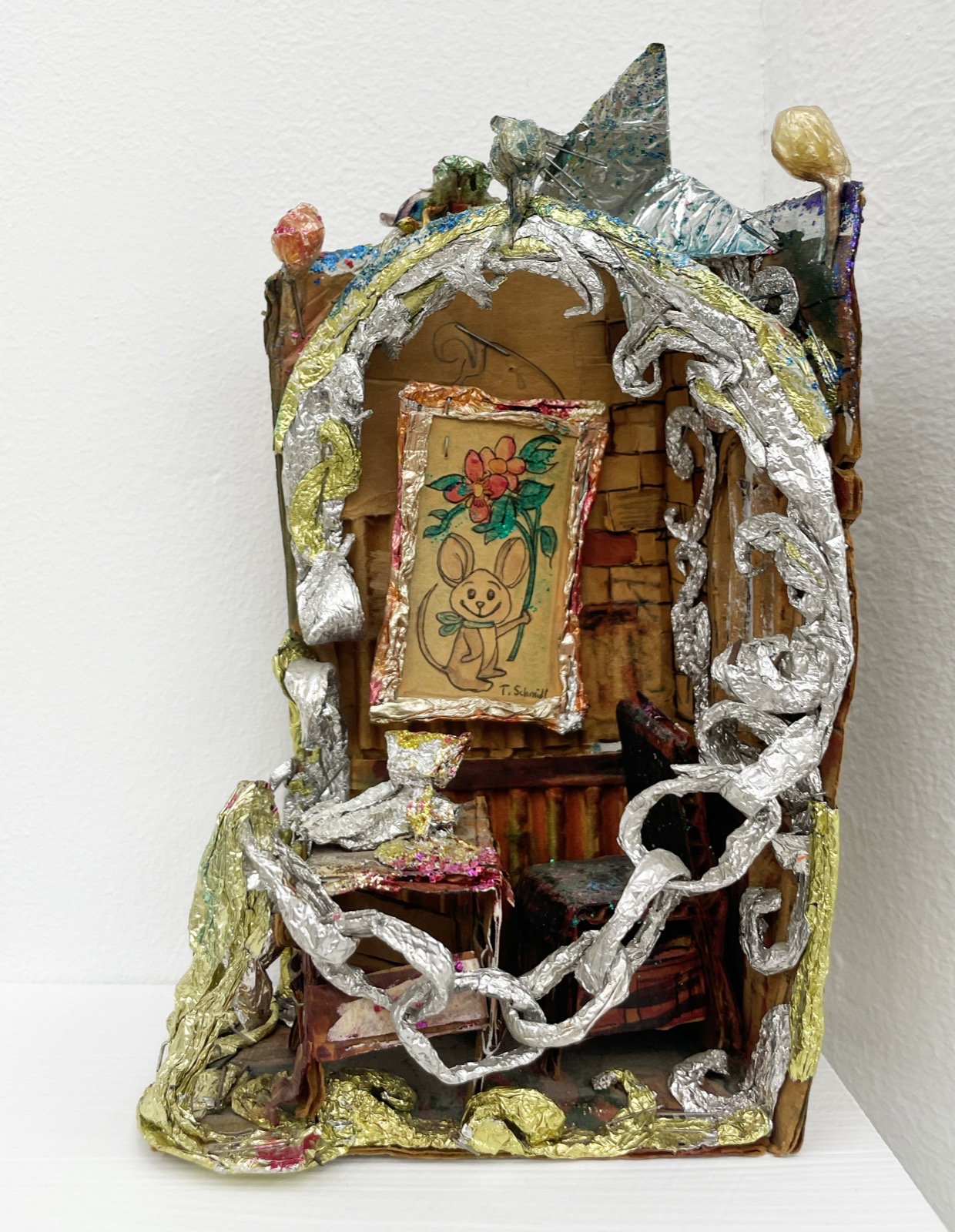 Untitled (Mouse Portrait), 1968-9 Cardboard, aluminum foil, plastic wrap, holographic tape, pipe cleaners, glitter, staples, colored marker